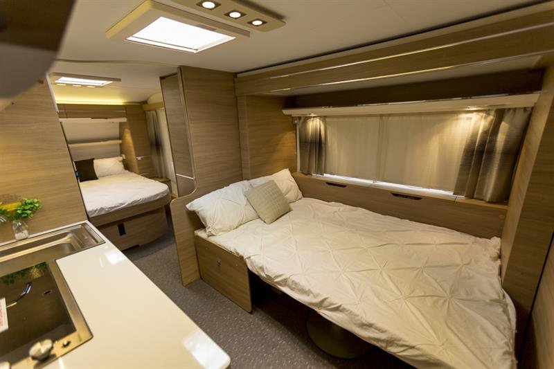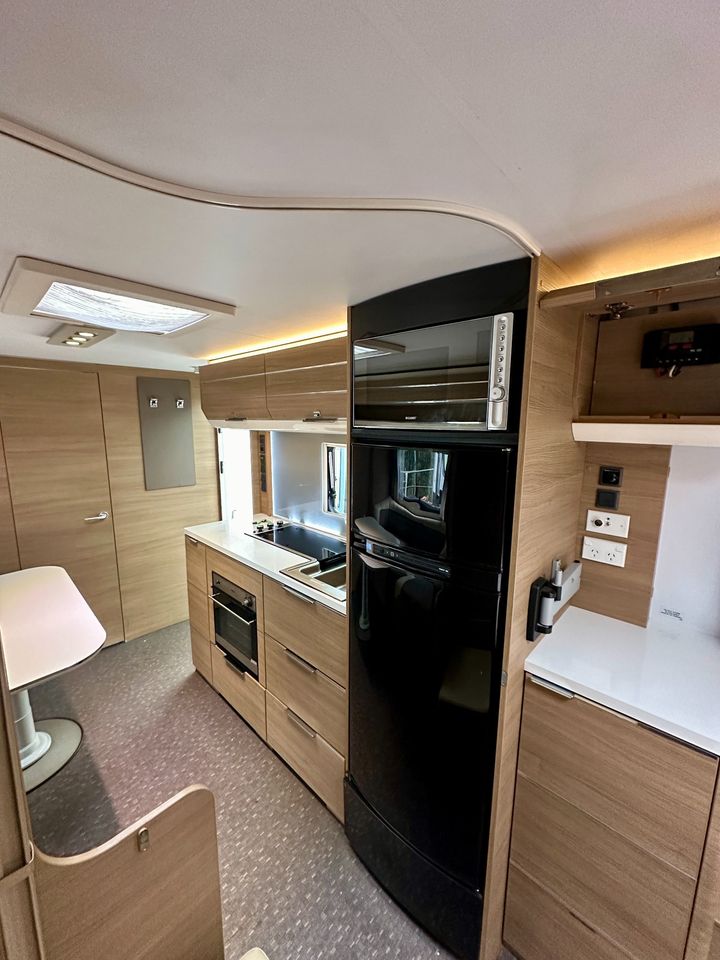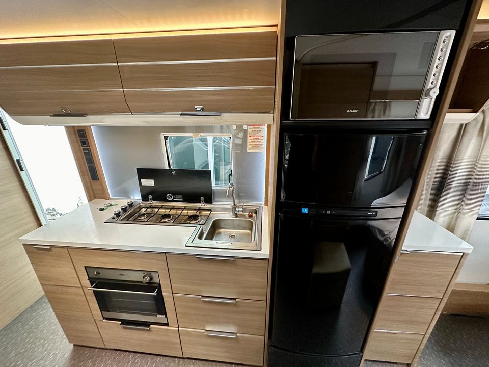 North/South facing island bed (1920mm x 1450mm); Slide out club lounge that converts into a double bed (2020mm x 1270mm; Ensuite with separate shower / toilet; Ducted air conditioning; Gas heating; Microwave oven; 3 burner gas cooktop oven and grill combination; Large 190L 3 way fridge and freezer; Bluetooth stereo with 2 internal speakers